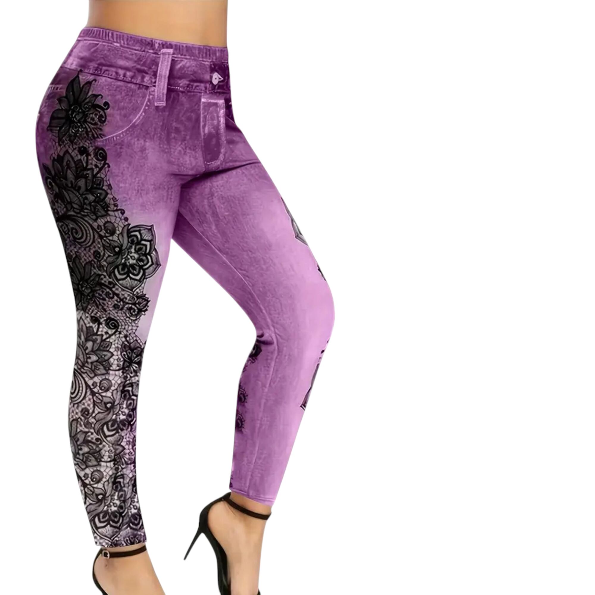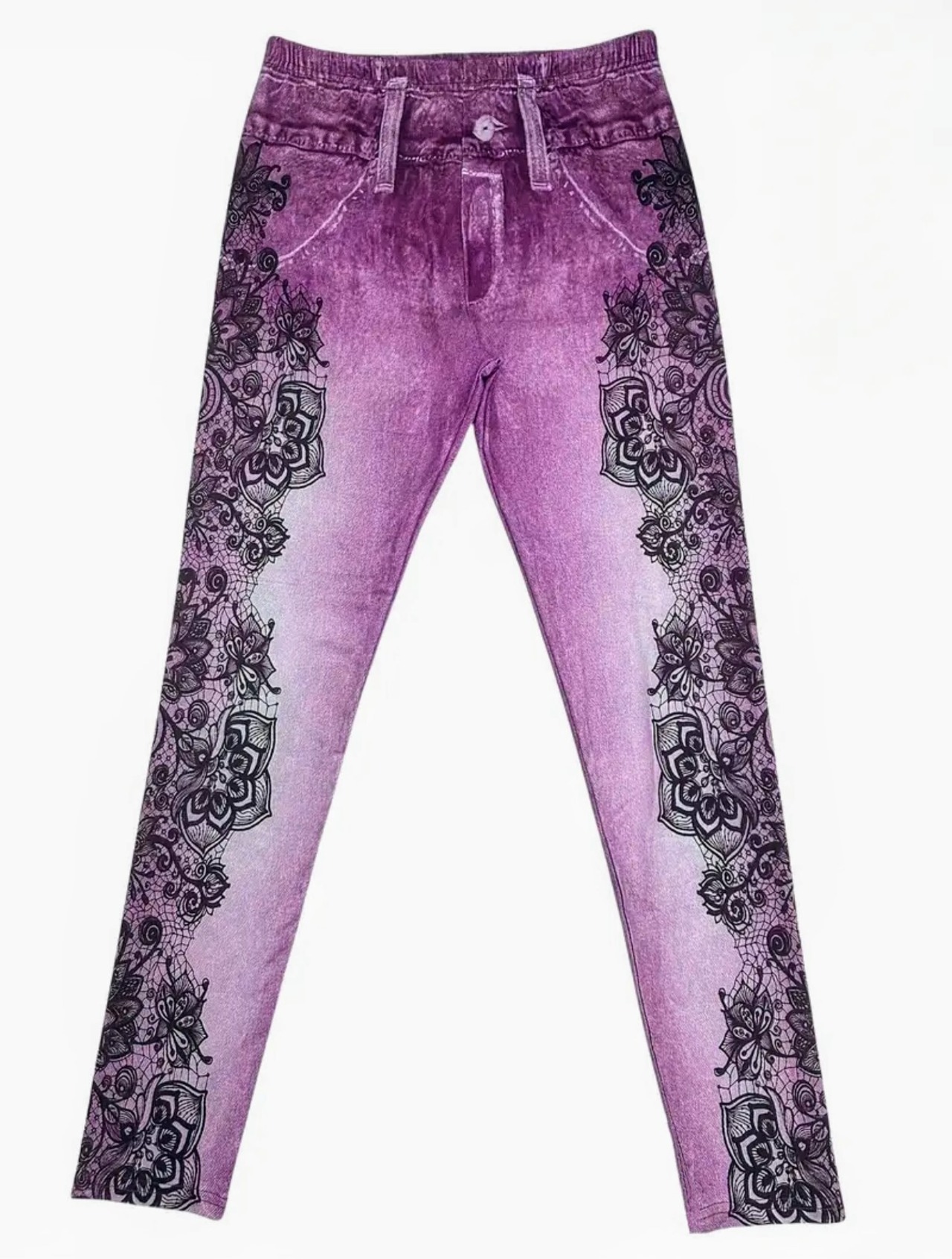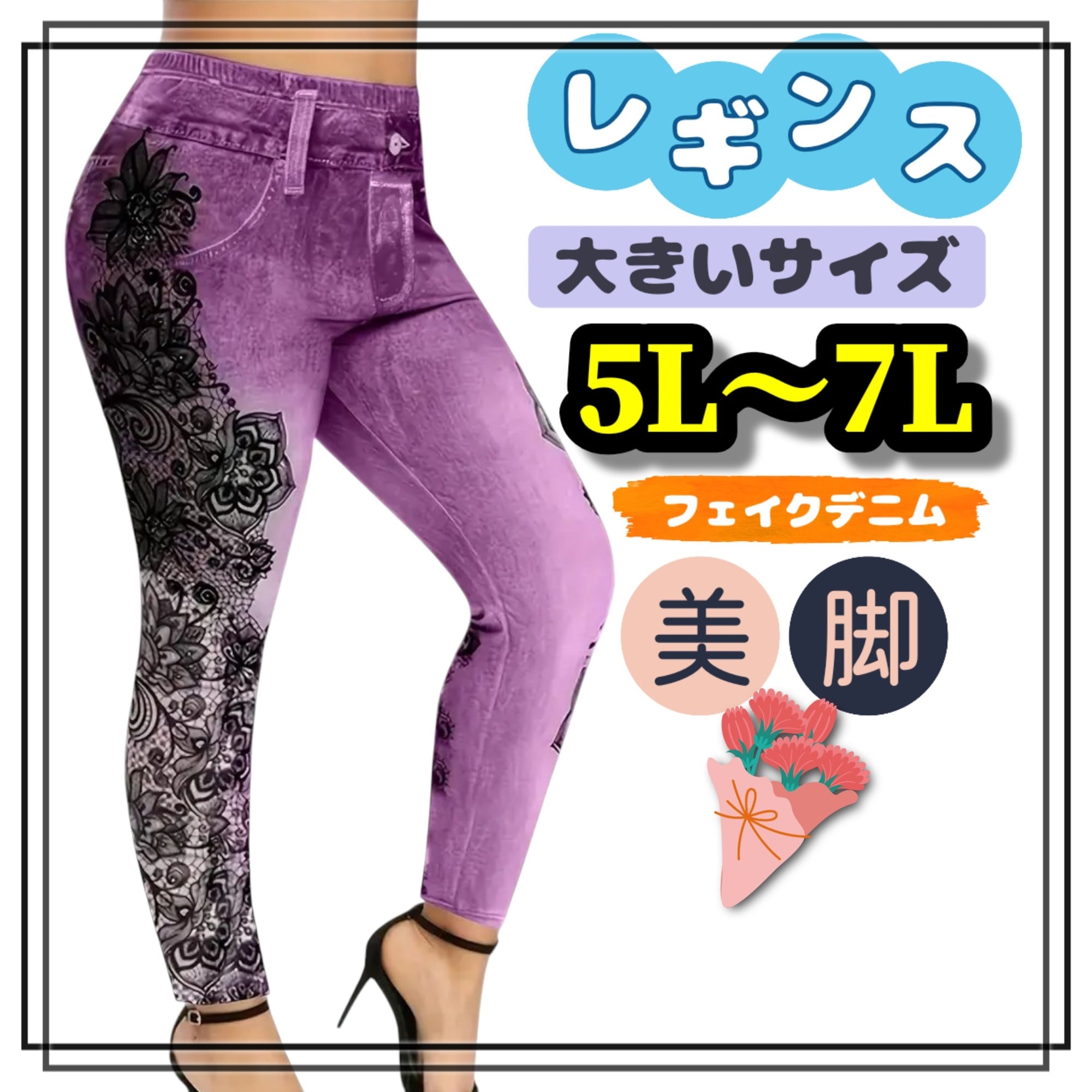 大きいサイズ レディース レギンス スパッツフェイクデニム フェイクパンツ レギンスパンツ レギパン 紫 レース ストレッチ 美脚 カジュアル ロング ゴシック パンク ロック ヒップホップ ストリート 地雷 レース プリント スキニー おしゃれ ぽっちゃり