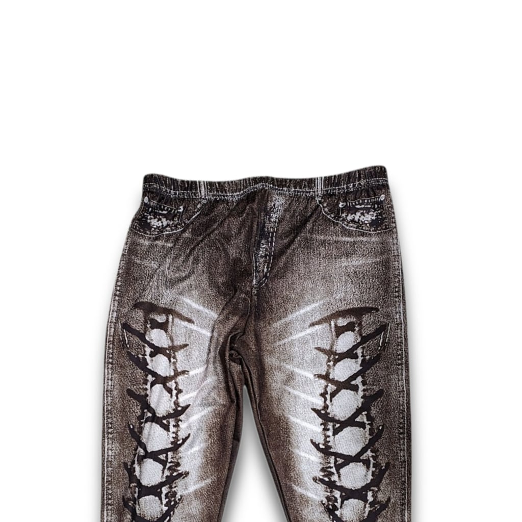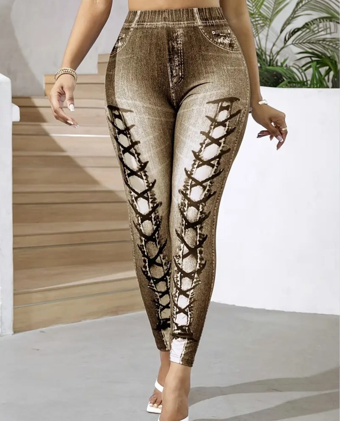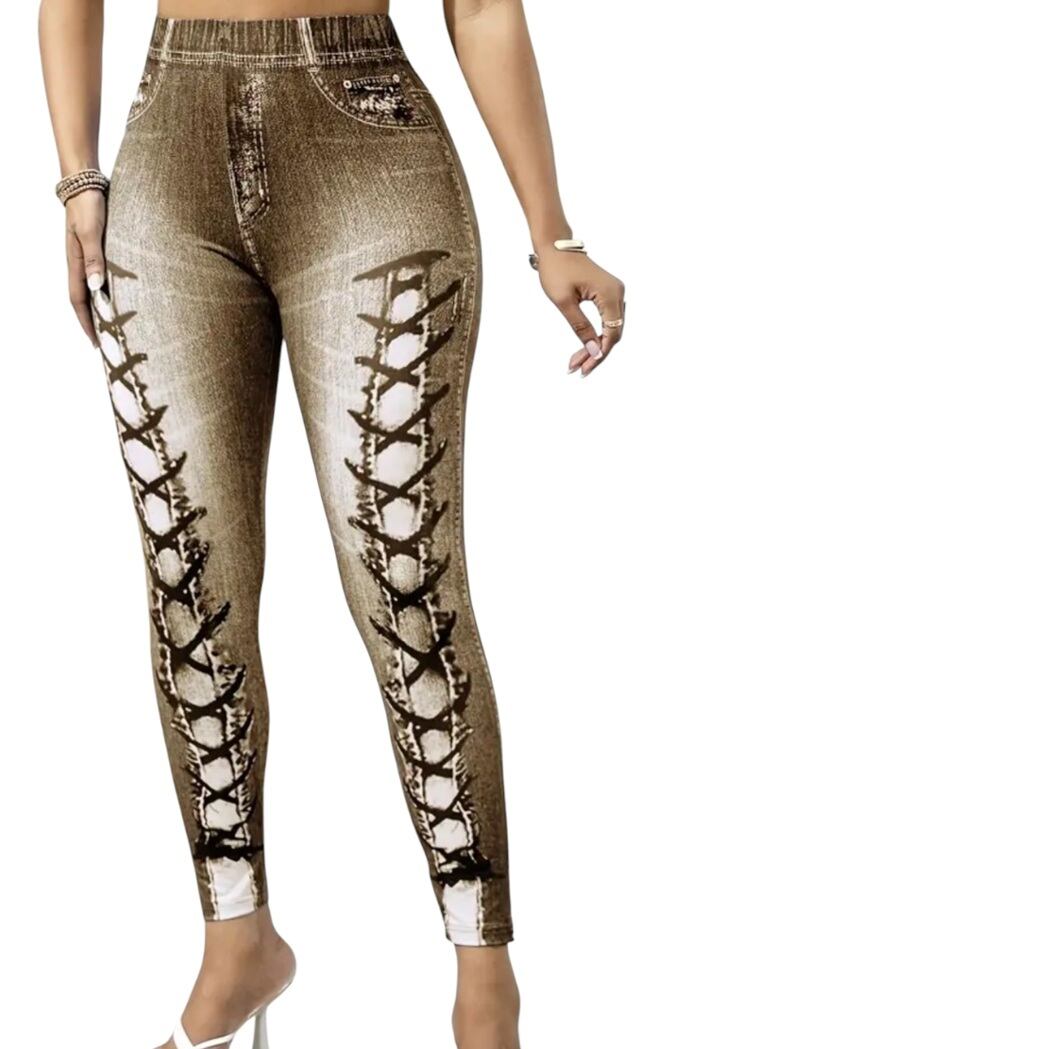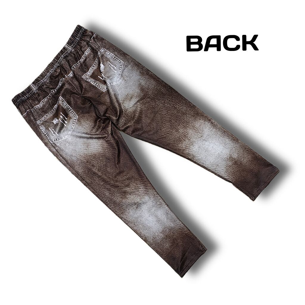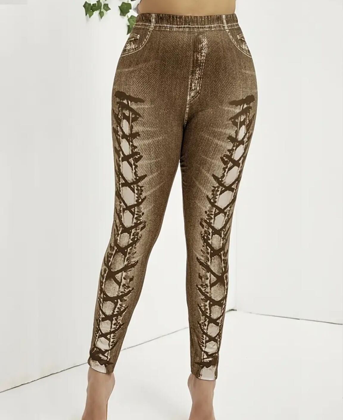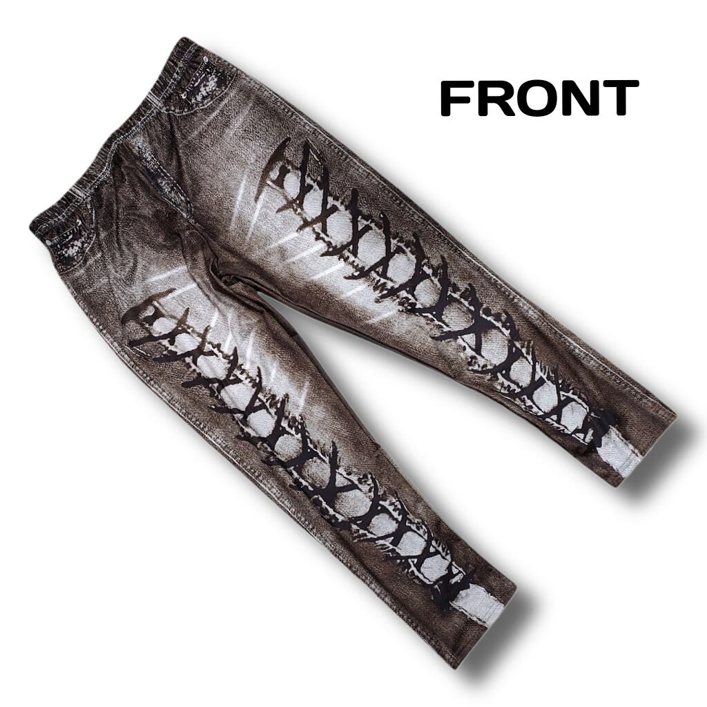 大きいサイズ レギンス スパッツ フェイクデニム フェイクパンツ 編み上げ ブラウン 美脚 ストレッチ 4L 5L 6L スキニー ダメージ 柄パンツ レギンスパンツ レギパン