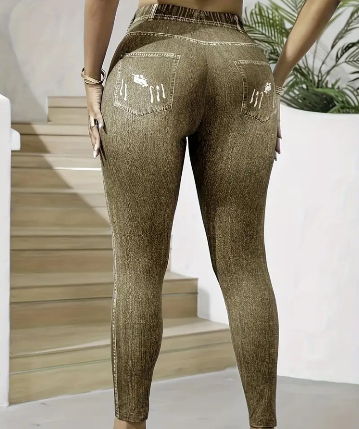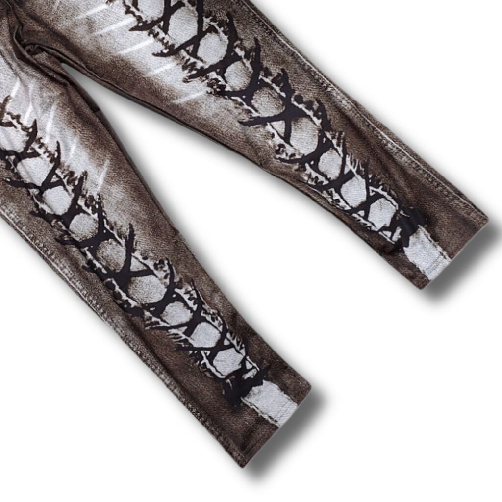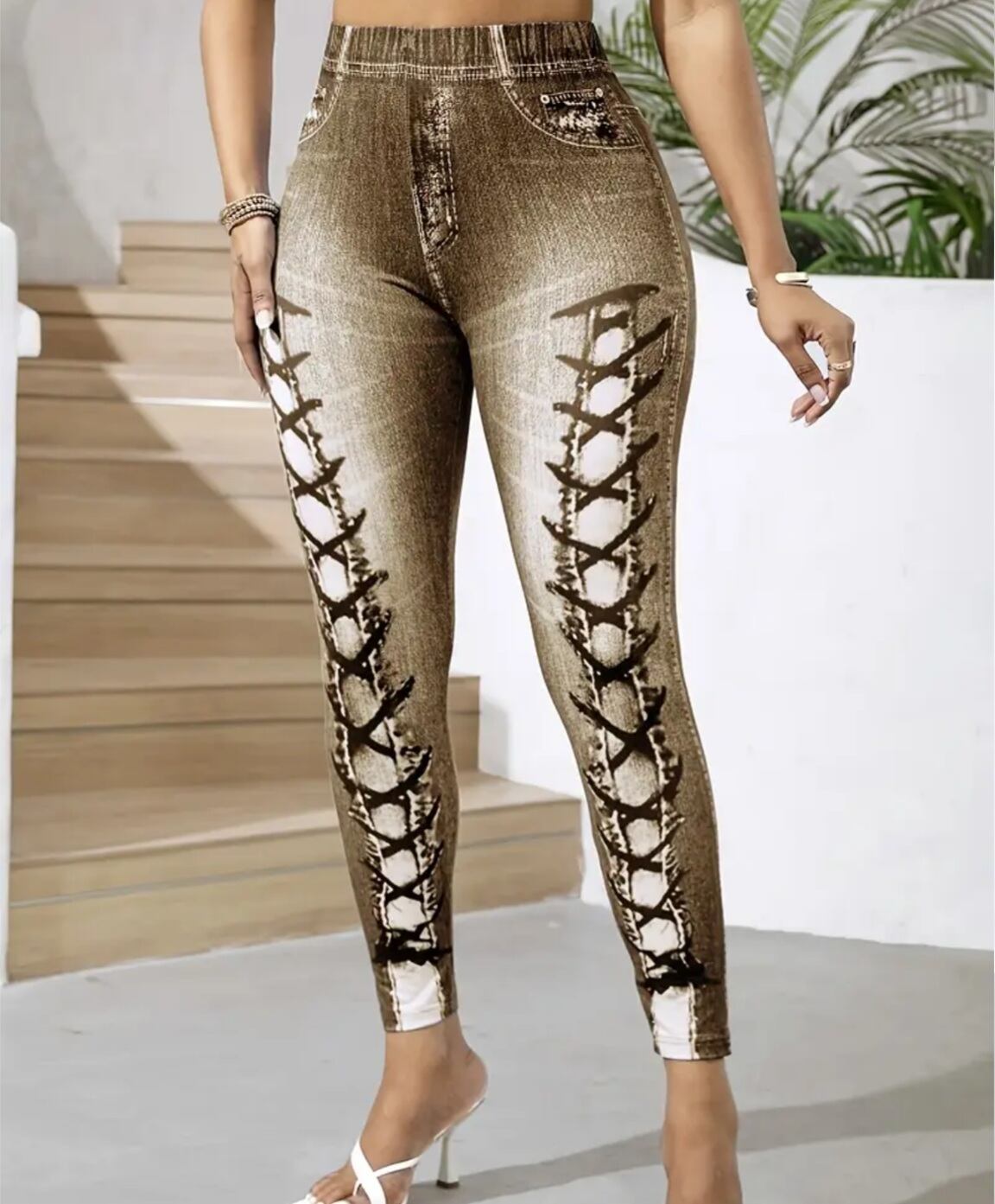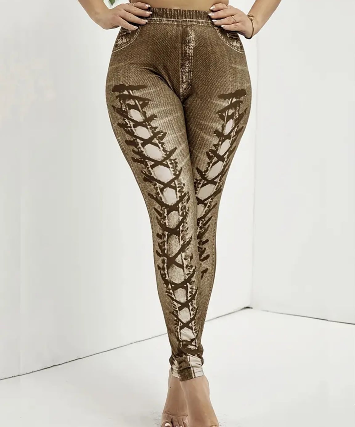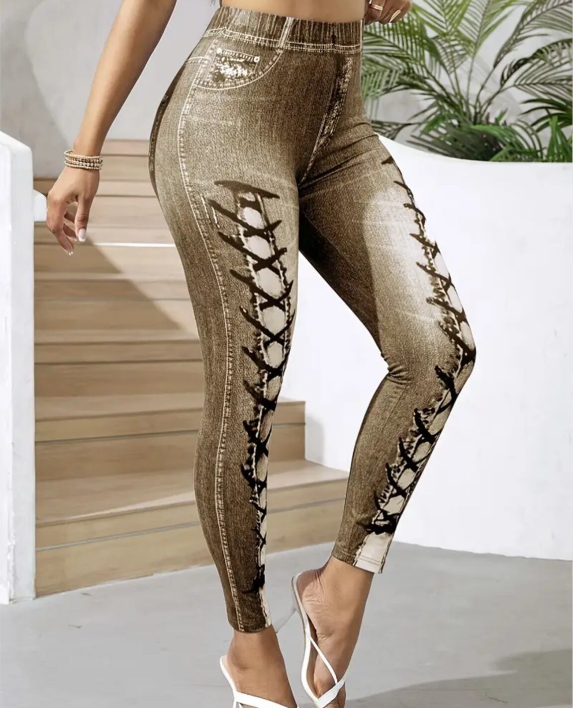 大きいサイズ レギンス スパッツ フェイクデニム フェイクパンツ 編み上げ ブラウン 美脚 ストレッチ 4L 5L 6L スキニー ダメージ 柄パンツ レギンスパンツ レギパン