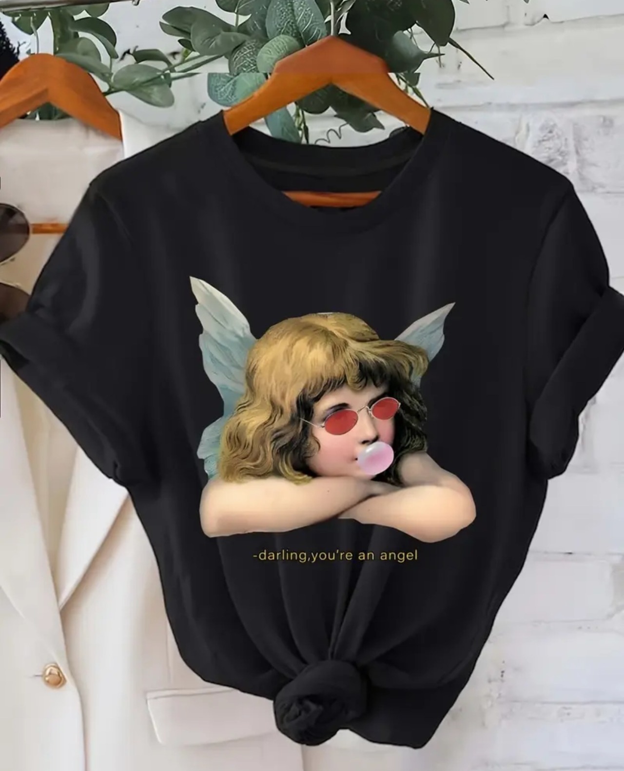 大きいサイズ レディース 半袖 Tシャツ エンジェル プリント プリントTシャツ オーバーサイズ 原宿 パロディ 3L 黒 ブラック