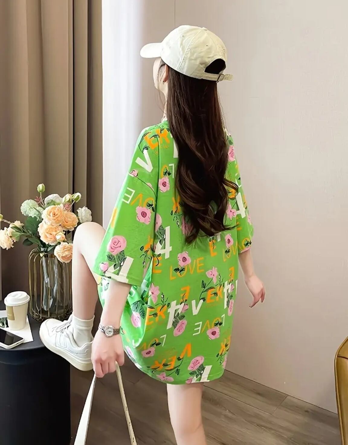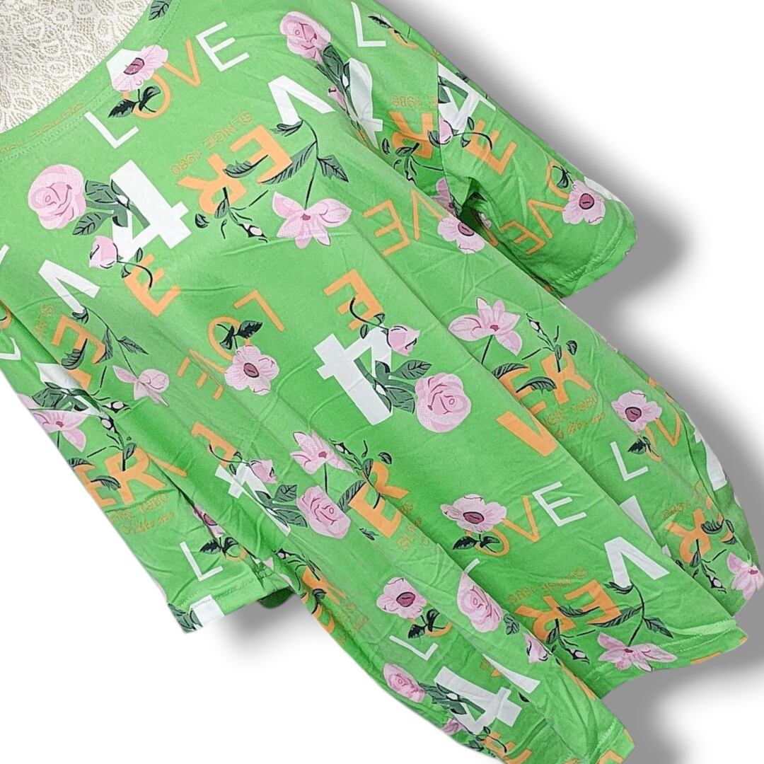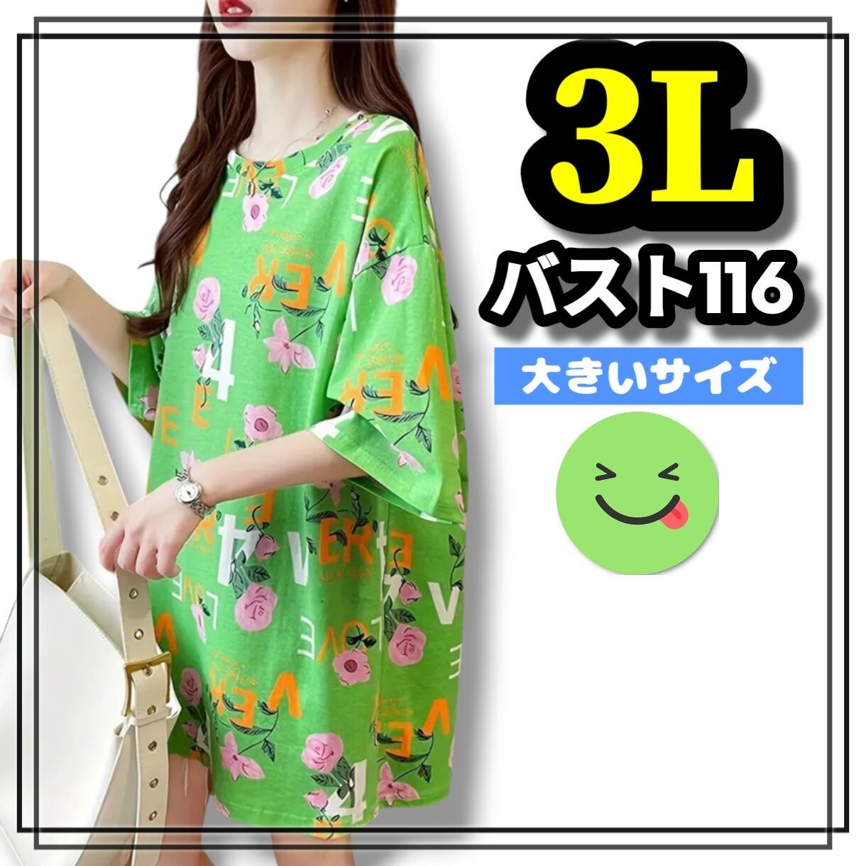 大きいサイズ レディース 半袖 Tシャツ 花柄 オーバーサイズ 緑 総柄 ぽっちゃり 原宿 婦人服 XL 3L
