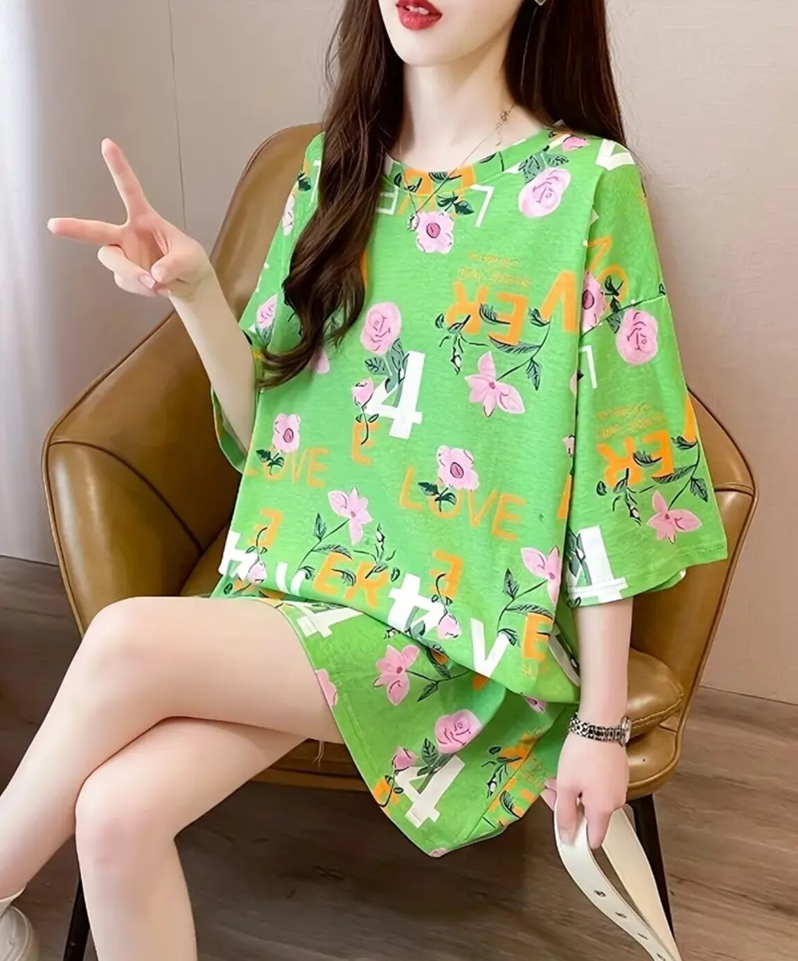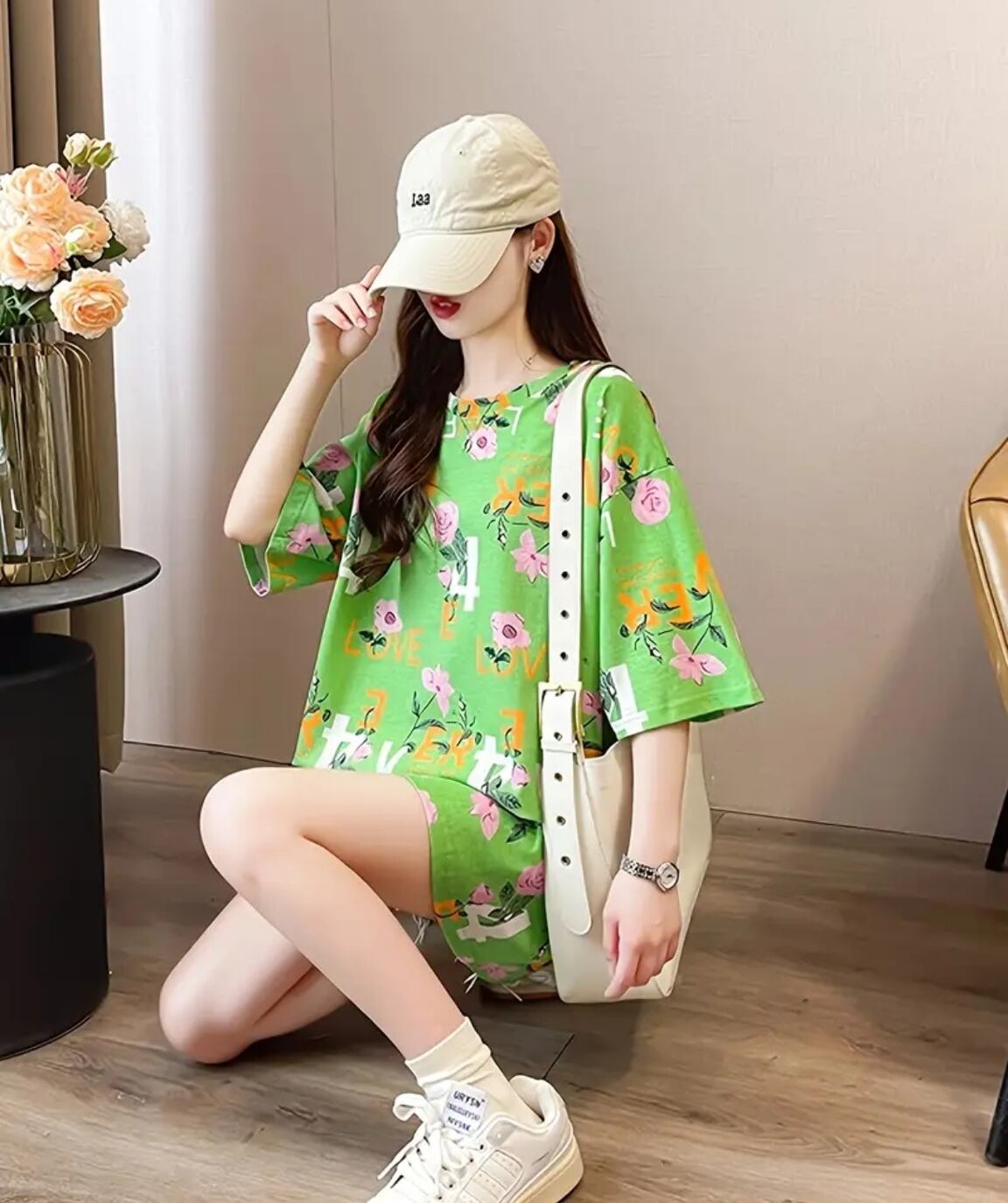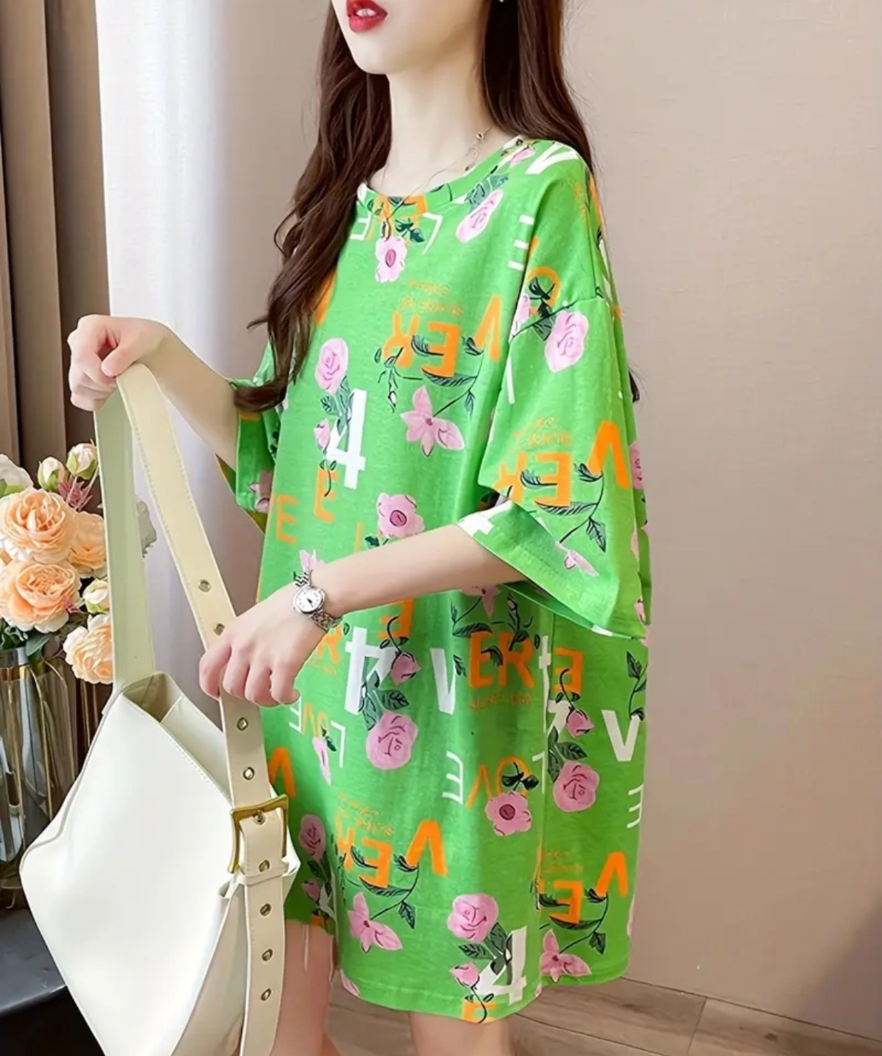 大きいサイズ レディース 半袖 Tシャツ 花柄 オーバーサイズ 緑 総柄 ぽっちゃり 原宿 婦人服 XL 3L